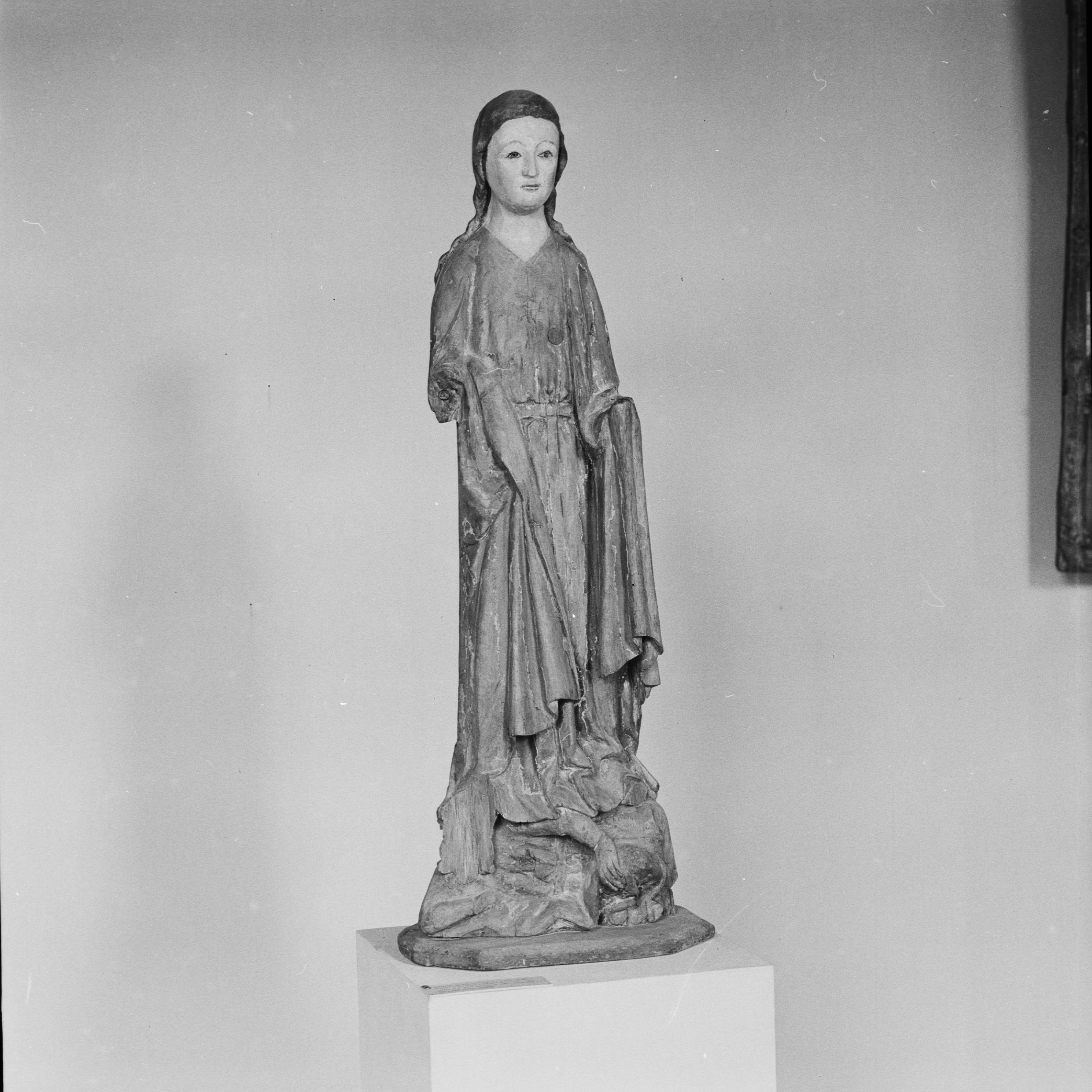 Skulptur, möjligen föreställande Sankta Margareta, trä, omkring 1300.
