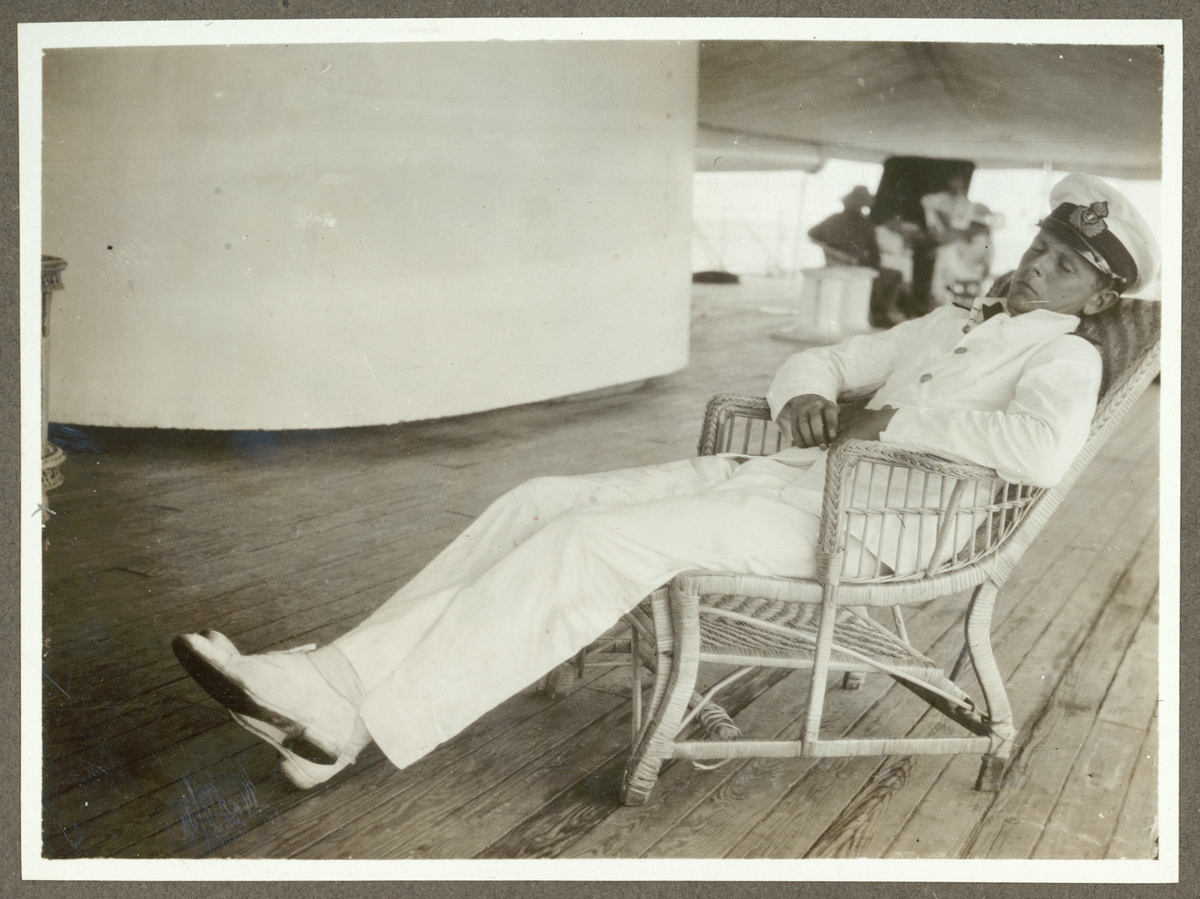 Bilden visar en fylgias befäl som ta en tupplur under solskyddet på fylgias akterdäck.