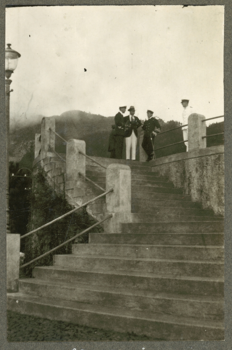 Bilden visar en grupp befäl från Fylgia som står ovanpå en trappa och pratar.