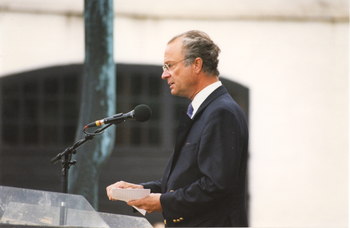 Sveriges Kung Carl XVI Gustav talar under invigningen av nya Marinmuseum 28 juni 1997.