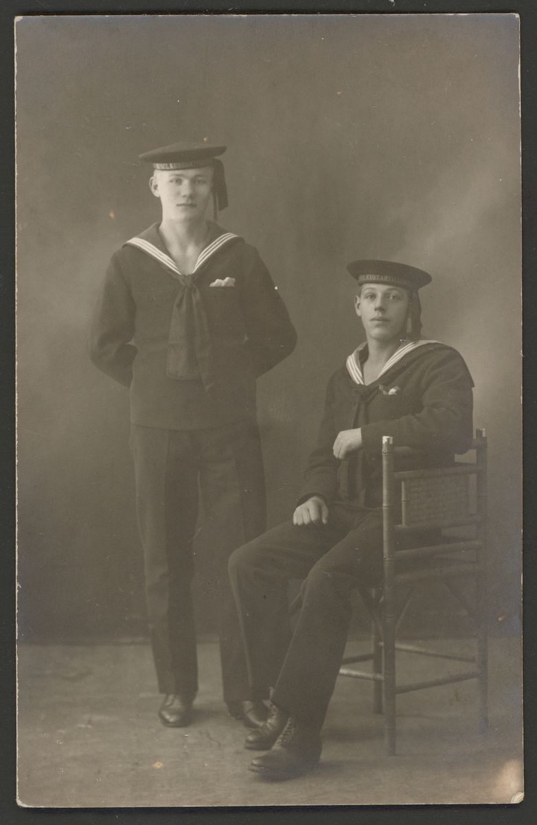 Bilden föreställer ett porträtt av Kalle Fransson och en okönt soldat från kustartilleriet.
