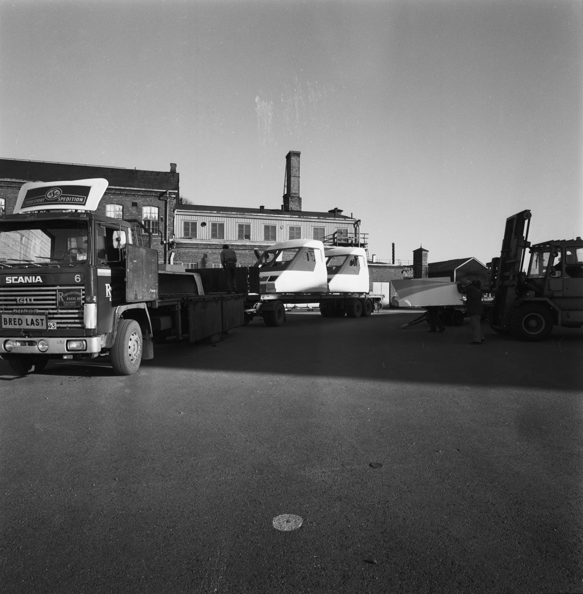 Bilden visar två förarhytter för en X 2000 tåg som har lyfts upp på en lastbil.