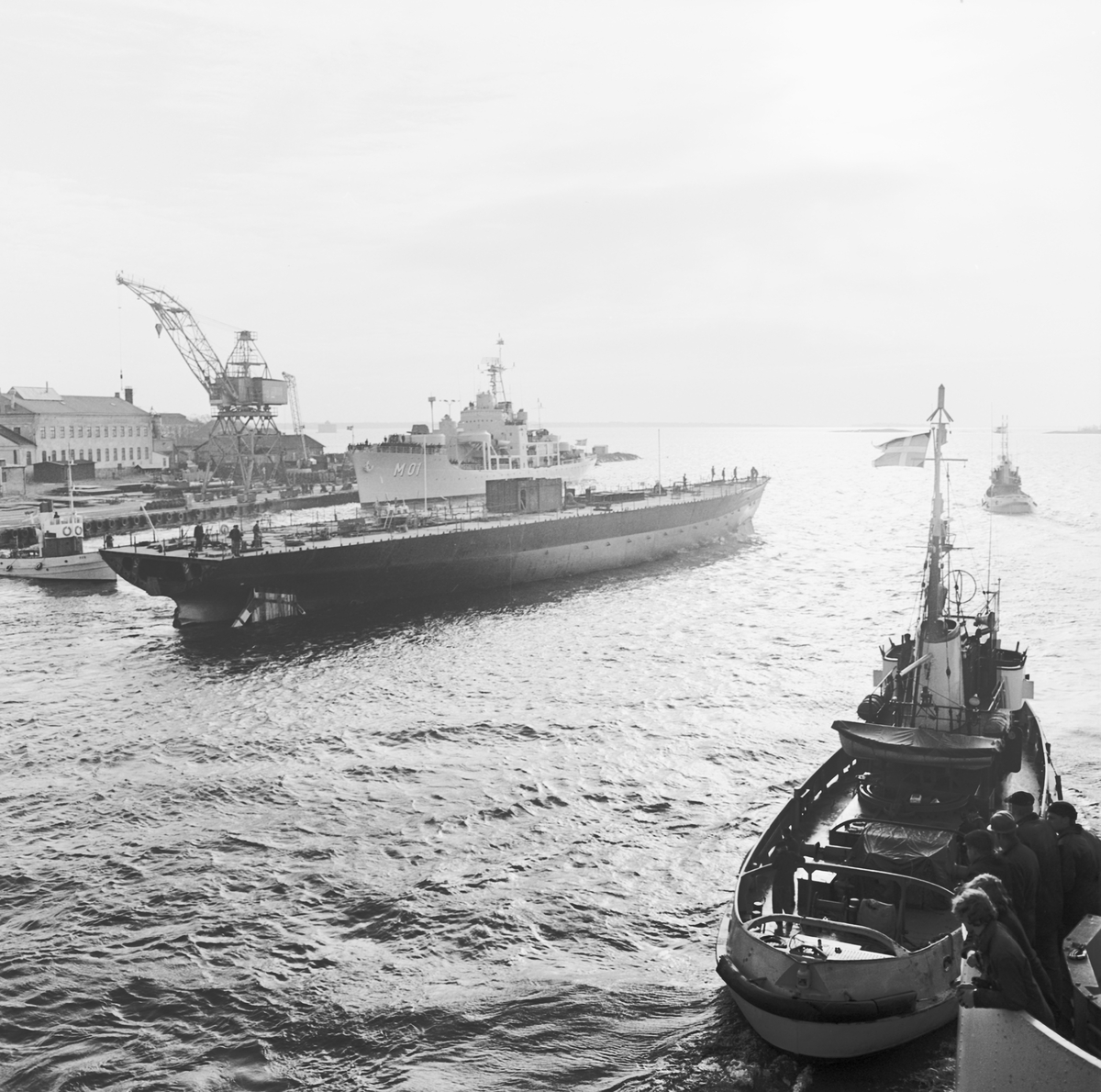 Bilden visar skrovet av minfartyget Älvsborg efter sjösättningen.