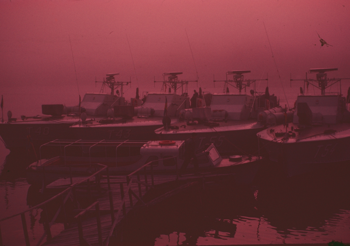 Bilden visar ett flertal motortorpedbåtar förtöjt vid en brygga i dimma.