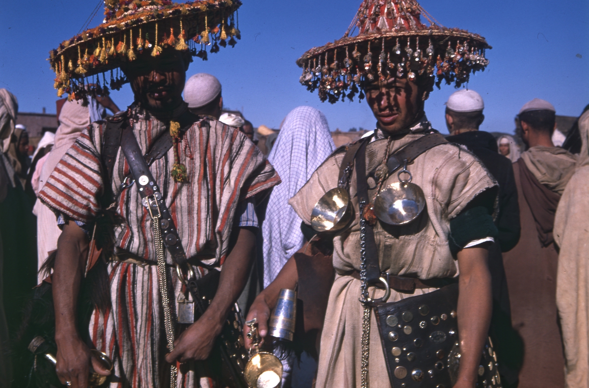 2 st män i stora hattar på marknad i Marocko.