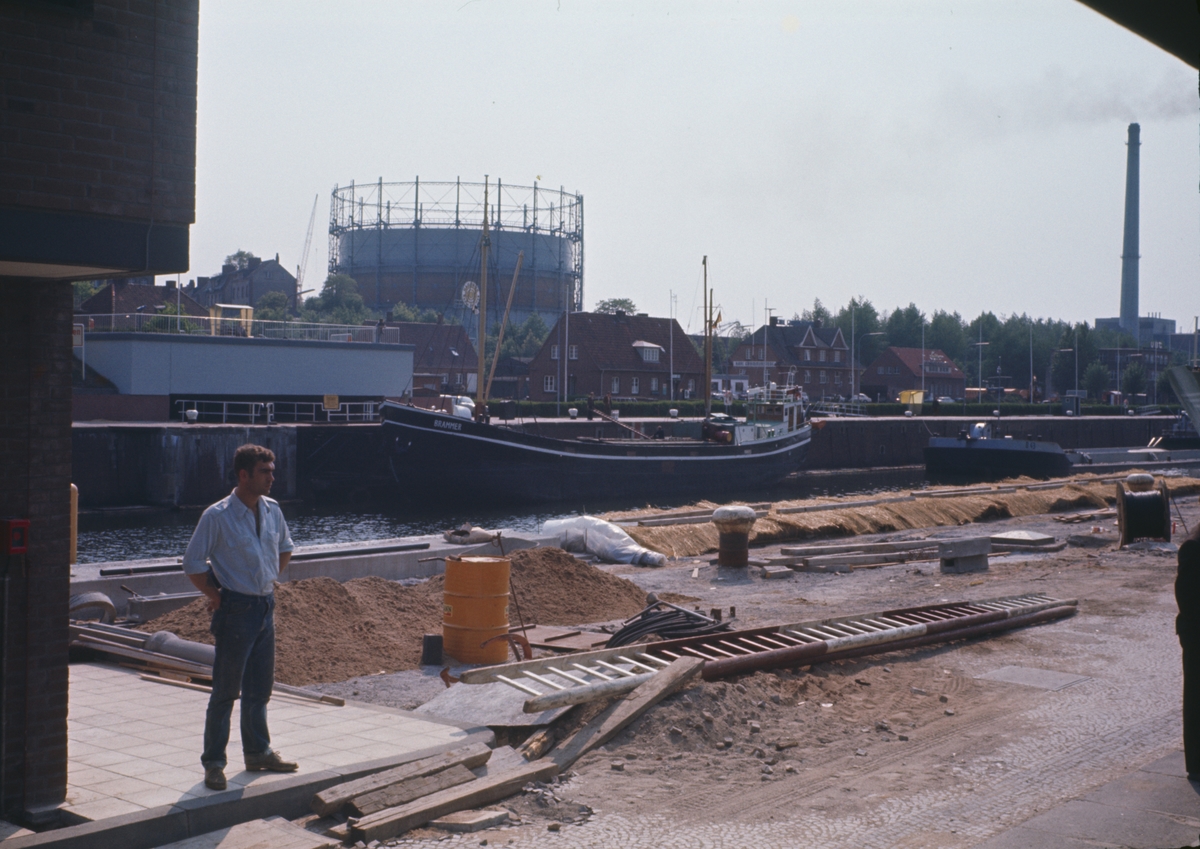 På bilden syns en sluss med byggarbetsplats vid Kielkanalen.