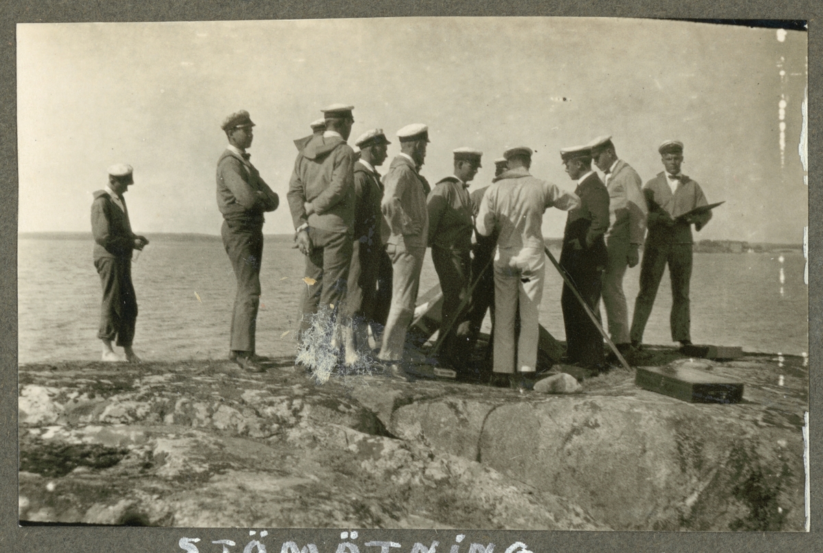 Bilden visar en grupp sjömän under praktiskt utbildning i sjömätning.
