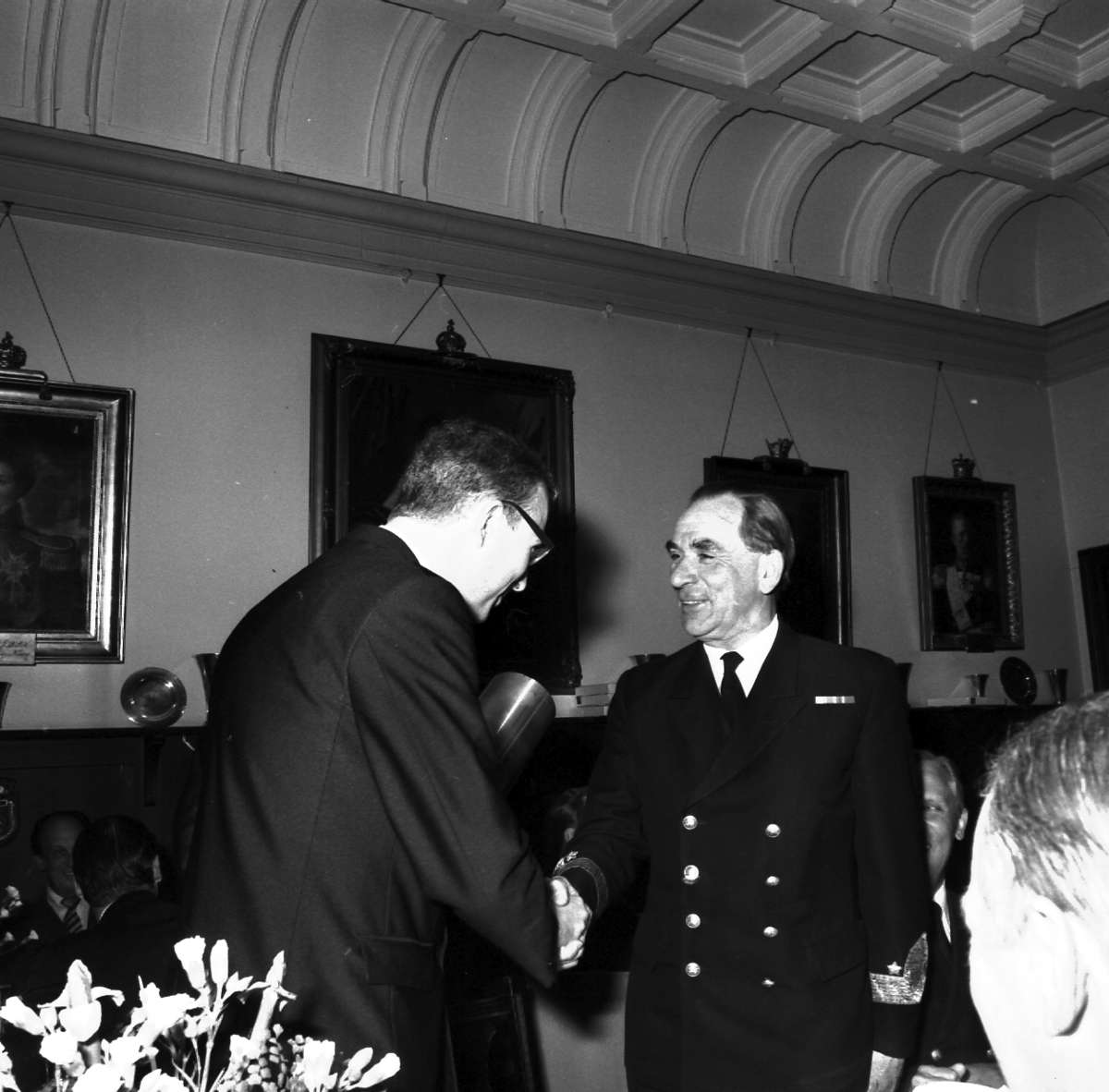 Bilder tagna vid sjösättningsmiddagen i samband med sjösättningen av minfartyget Carlskrona. En man och en amiral står upp och tar varandra i hand i sjöofficermässen. Runt omkring sitter fler män och militärer runt middagsbord. På väggen hänger tavlor med kraftiga ramar.