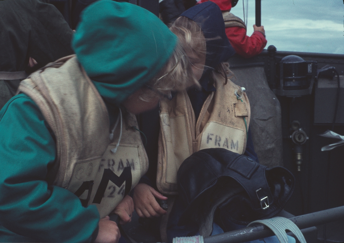 Bilden visar två besökare i samtal ombord på en motortorpedbåt.