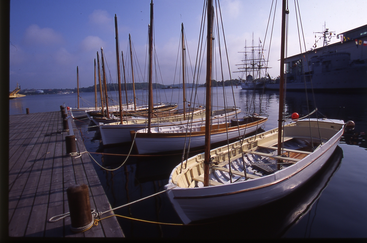 barkar liggande förtöjda vid slup o barkass Stumholmen i bakgrunden Marinmuseum med Jarramas