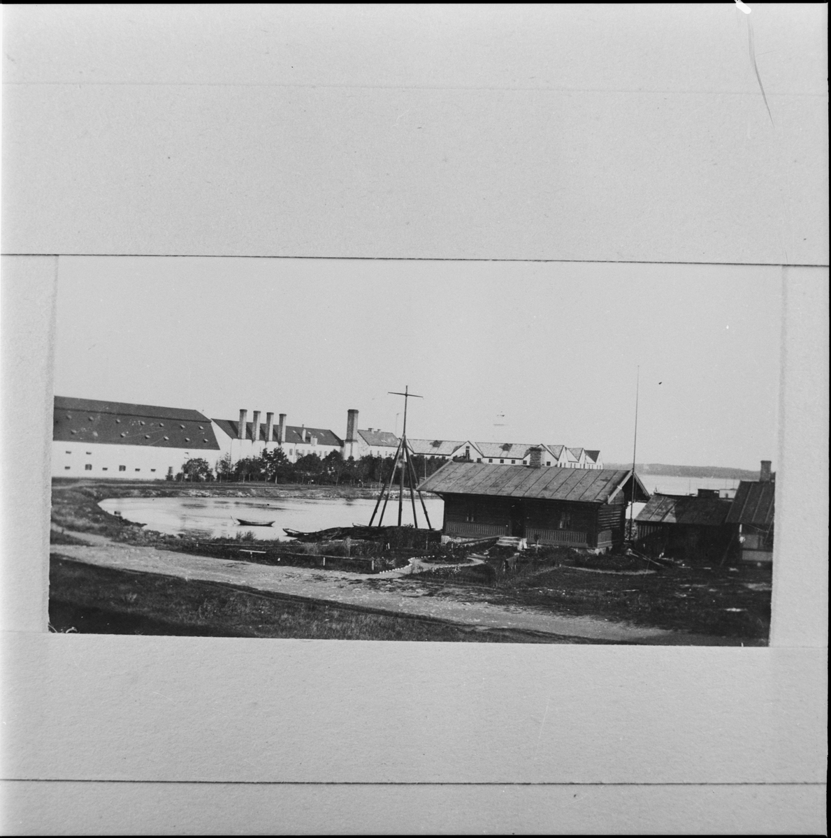 Reproduktionen föreställer en vy från Kungshall mot byggnader på Stumholmen. I förgrunden syns Lotsstugan.
