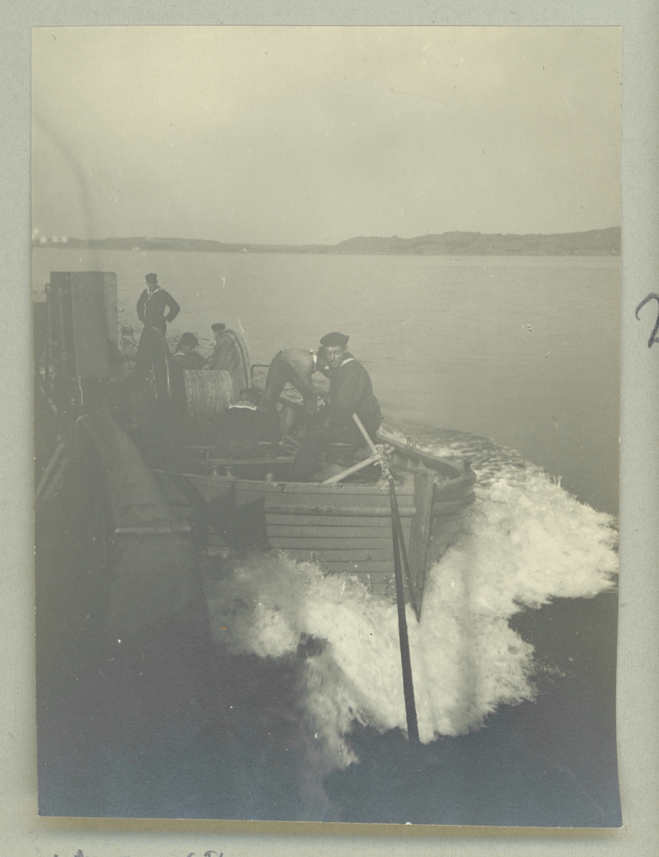 Bilden visar en barkass som bogseras långsides av ett större fartyg. I barkassens mitt sitter en kabeltrumma.