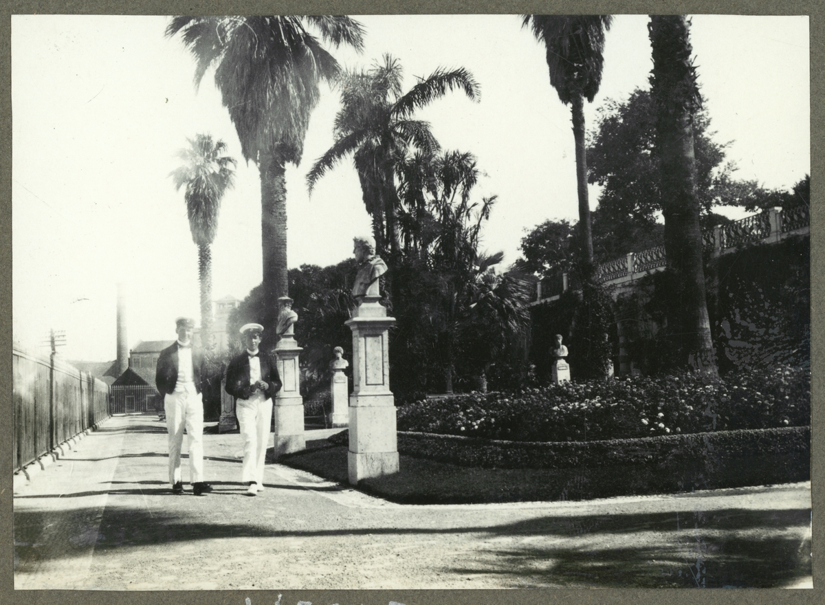 Bilden förställer två sjömän som promenerar i en park i Lissabon.
