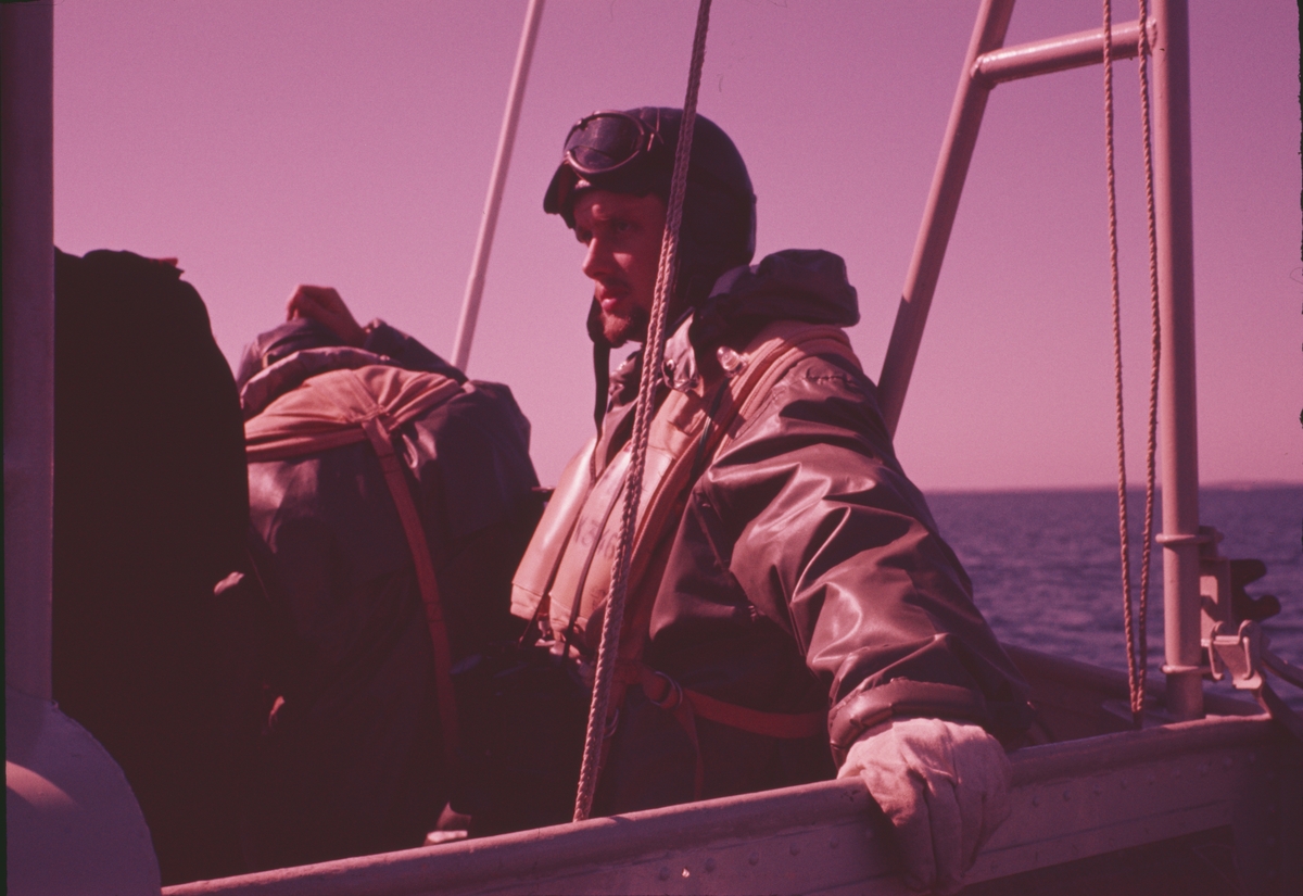 Bilden visar sjömän en sjöman med skyddskläder och flytväst ombord på ett fartyg