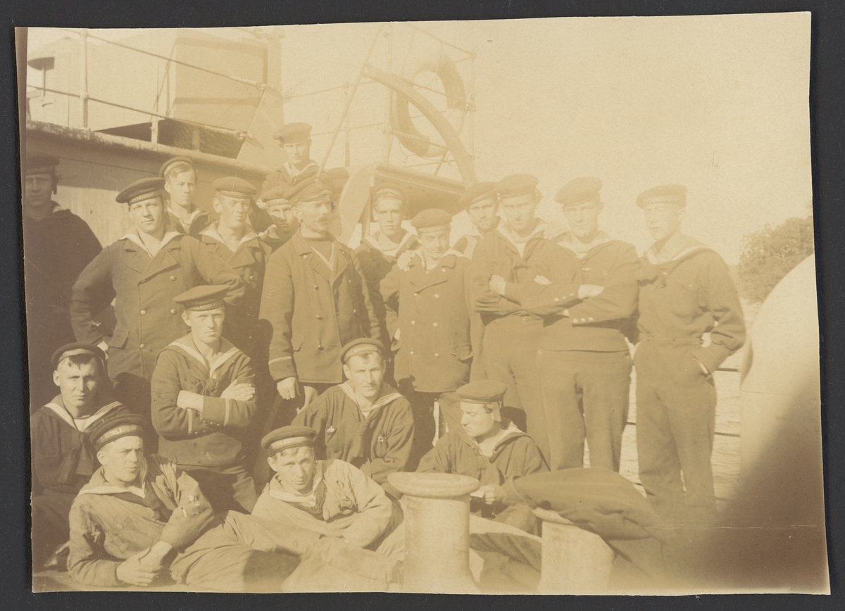 Bilden visar manskapet på Ballongfartyget nr 1 som har samlats för en gruppfoto. Andre mannen från vänster i andra raden ska vara Birger Hallgren.