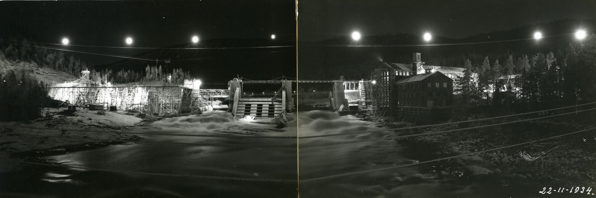 Arbetsbilder från vattenrallare Egon Frisk. Bygge av vattenkraftverk i Krångede, upplyst av lycktor.