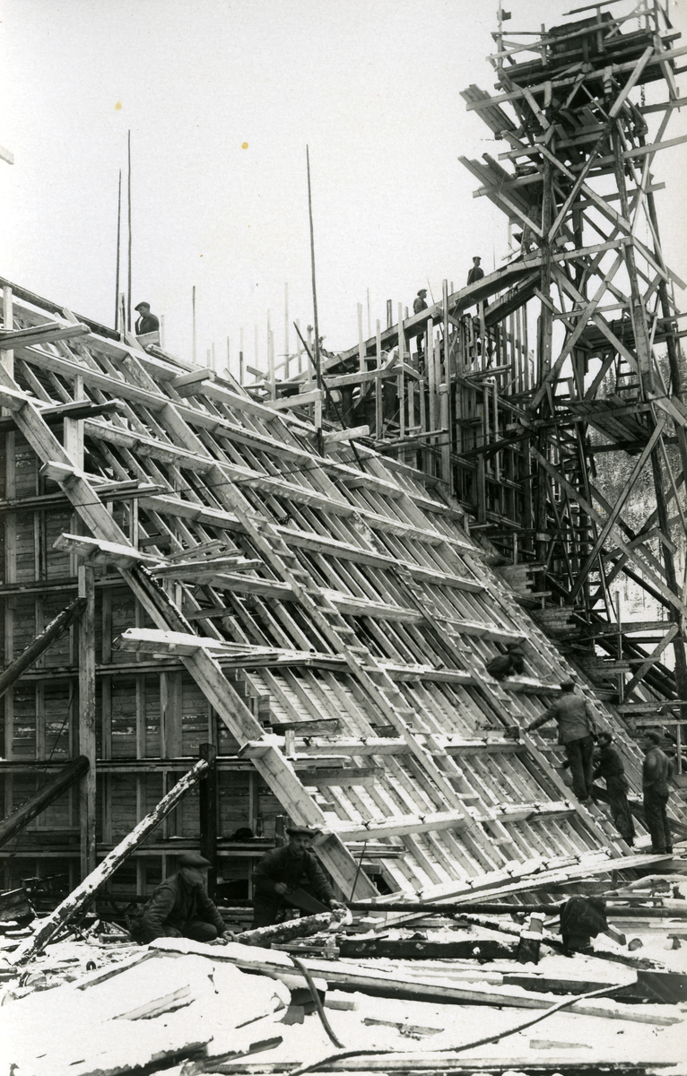 Arbetsbilder från vattenrallare Egon Frisk. Vattenrallare på en byggställning vid bygge av vattenkraftverk i Krångede.