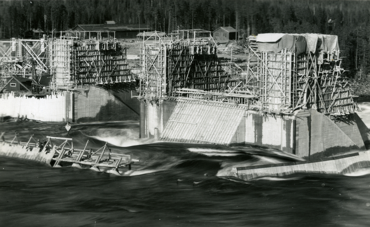 Arbetsbilder från vattenrallare Egon Frisk. Vattenrallare på en byggställning vid bygge av vattenkraftverk i Krångede.