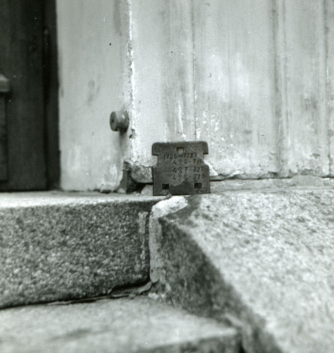 Ett luckskydd tillhörande vedspis står lutat mot en vägg.