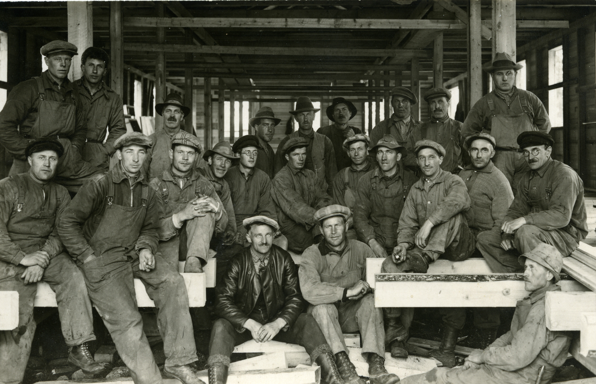 Arbetsbilder från vattenrallare Egon Frisk. Ett arbetslag som arbetar med byggnation av vattenkraftverk i Krångede. I mitten syns arbetsledare John August Frisk.