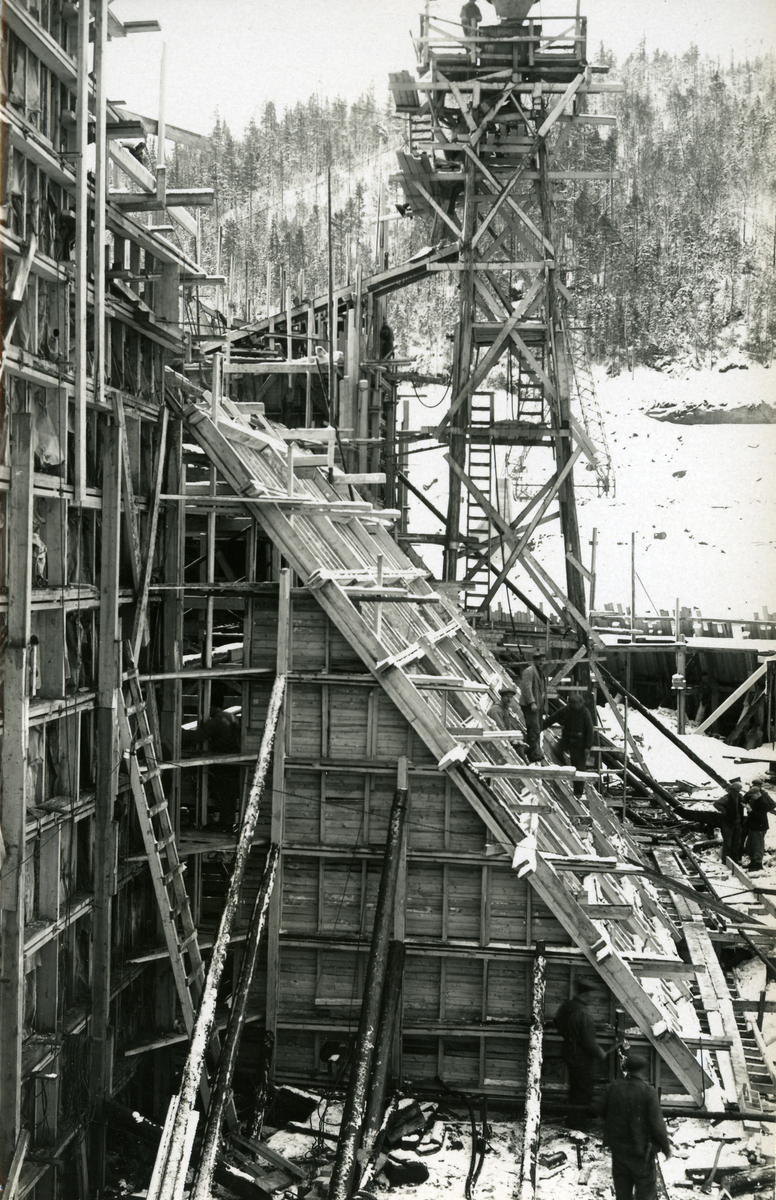 Arbetsbilder från vattenrallare Egon Frisk. Vattenrallare på en byggställning vid bygge av vattenkraftverk i Krångede.