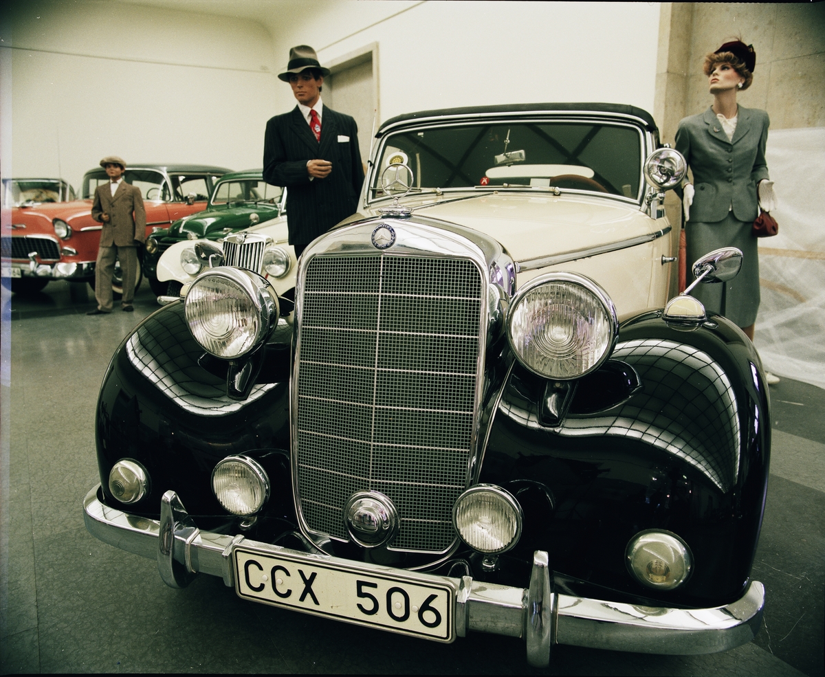 Pressbilder av "Automobilhistoriska klubben" utställning, Sverige- salen. Mercedes 170 A, årsmodell 1950 och dockor med 50-tals kläder.