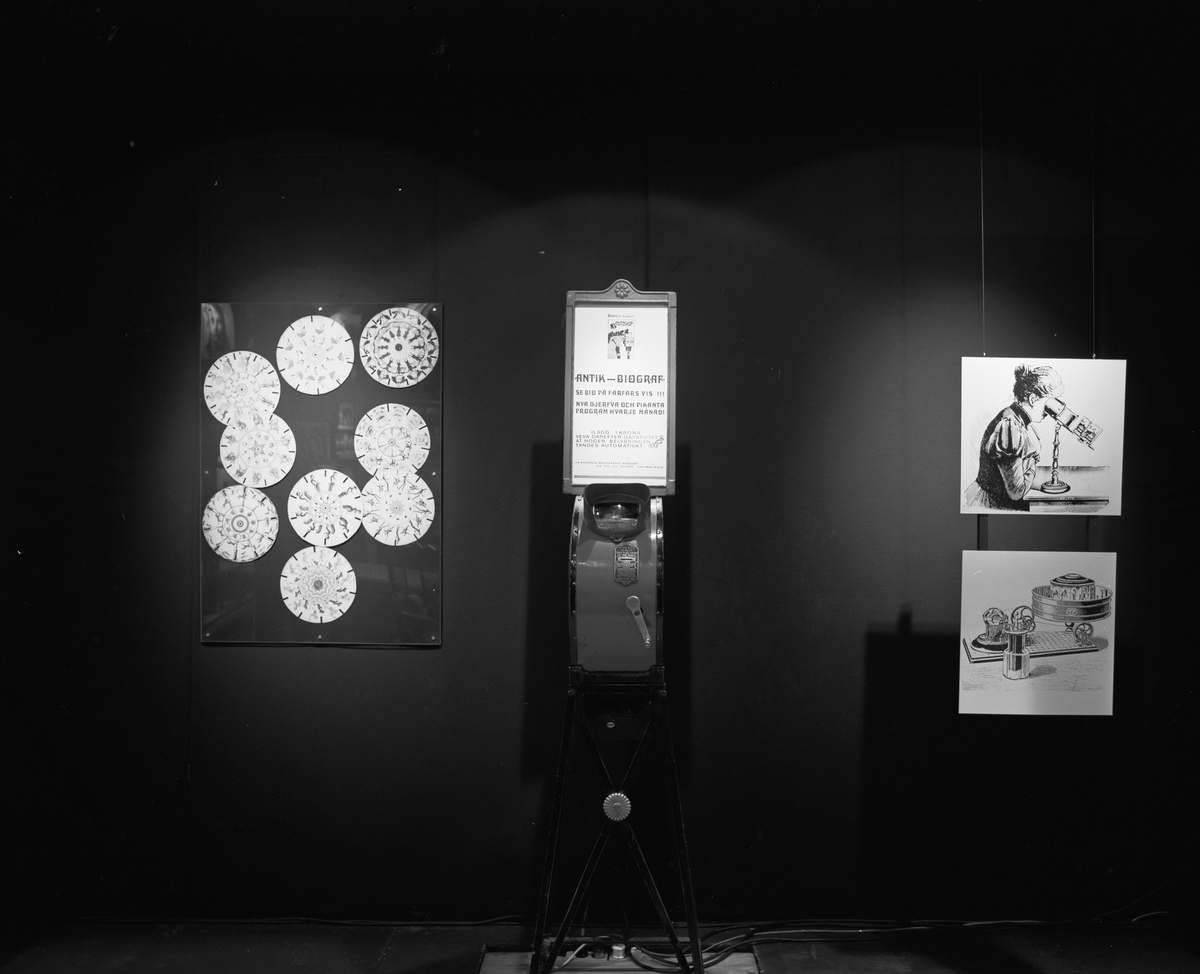 Mutoskop från 1890-talets USA i mitten. T h snurror för Phenakistoskop från 1840-talet. Inför filmen 100 år gjordes en utställning "Magiska Bilder komik, erotik,>> optik" den 26 april - 12 jan 1997. Producerad av Svenska Filminstitutet i samarbete med Telemuseum och Tekniska Museet. Formgivning Mikael Sylwan och ulrika Wolff. Idé och koncept Anna-Lena Wibom.