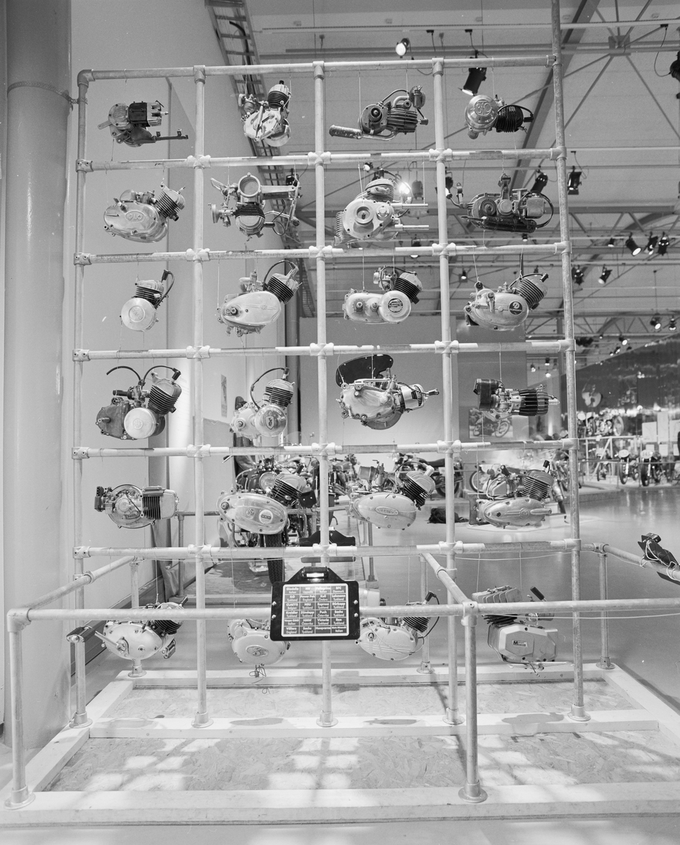 Dokumentation av "Motorcykeln 100 år" i Wallenberghallen. Ställ med mopedmotorer.