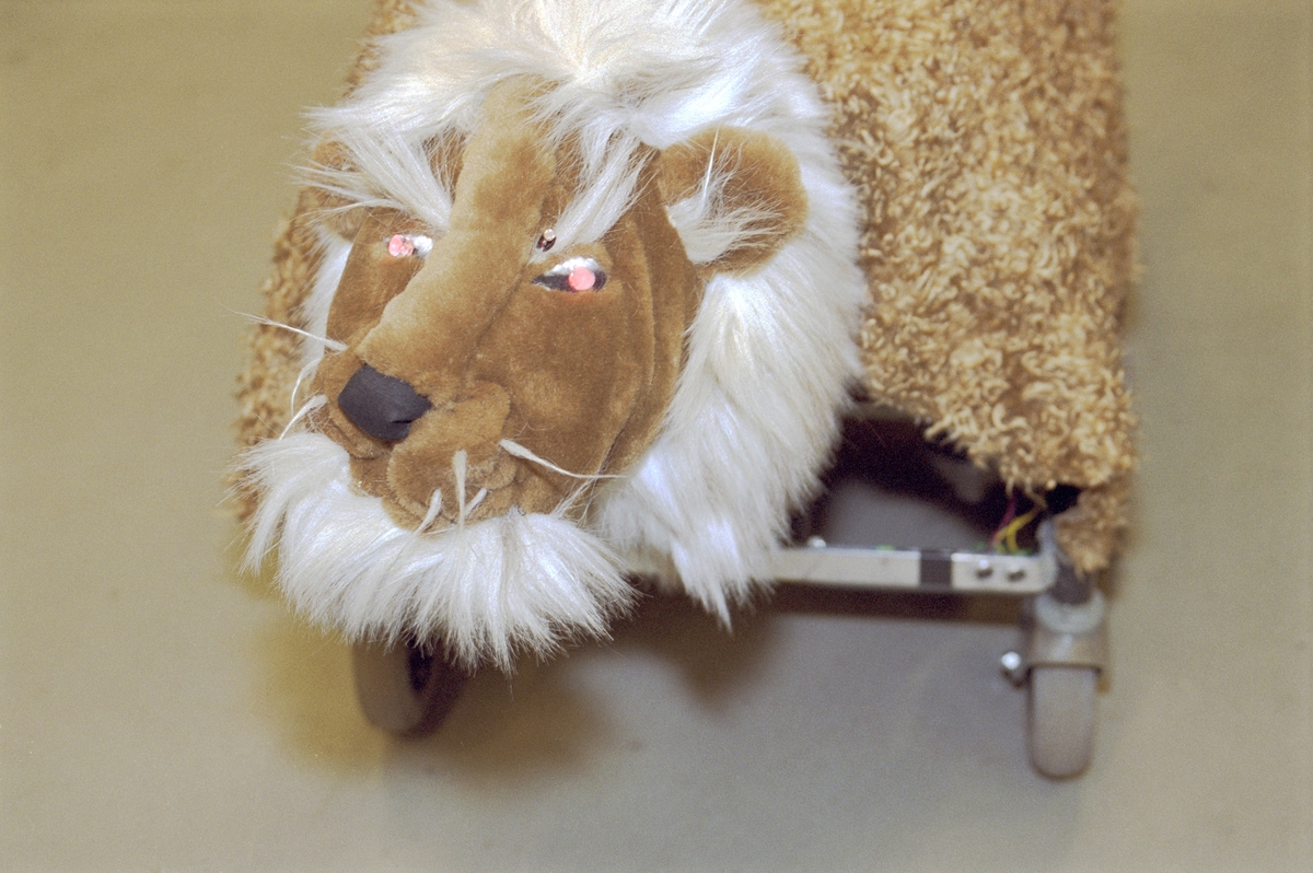 Bildtext: KTH har gjort Robotar på djur temat under en 5 poängs kurs. Dessa finns med i utställningen. Här är lejonet byggd på en eletrisk rullstol.