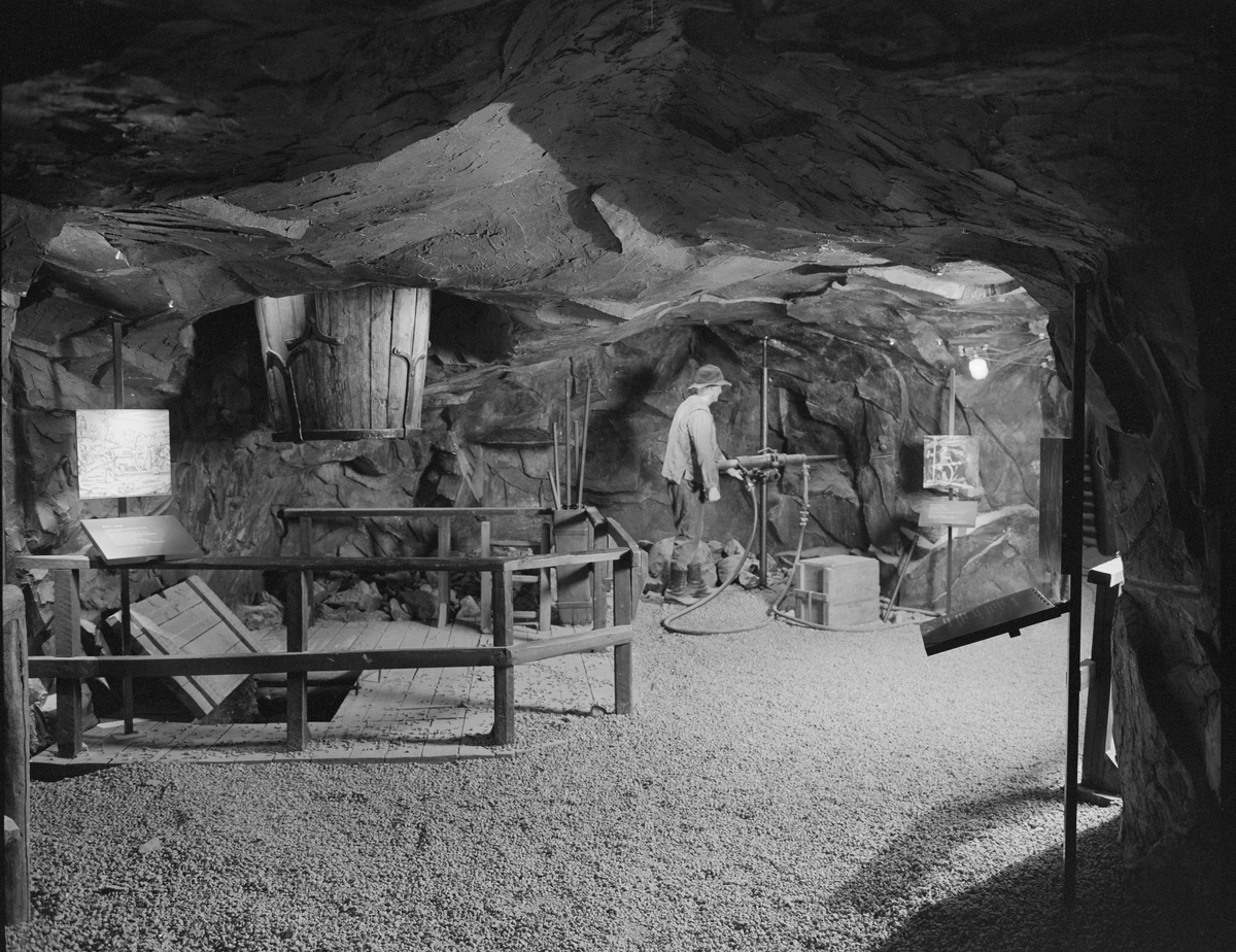 Dokumentation av Gruvutställningen. Tredje rummet: Interiör. Uppfordringstunna, tryckluftsborrning, docka.