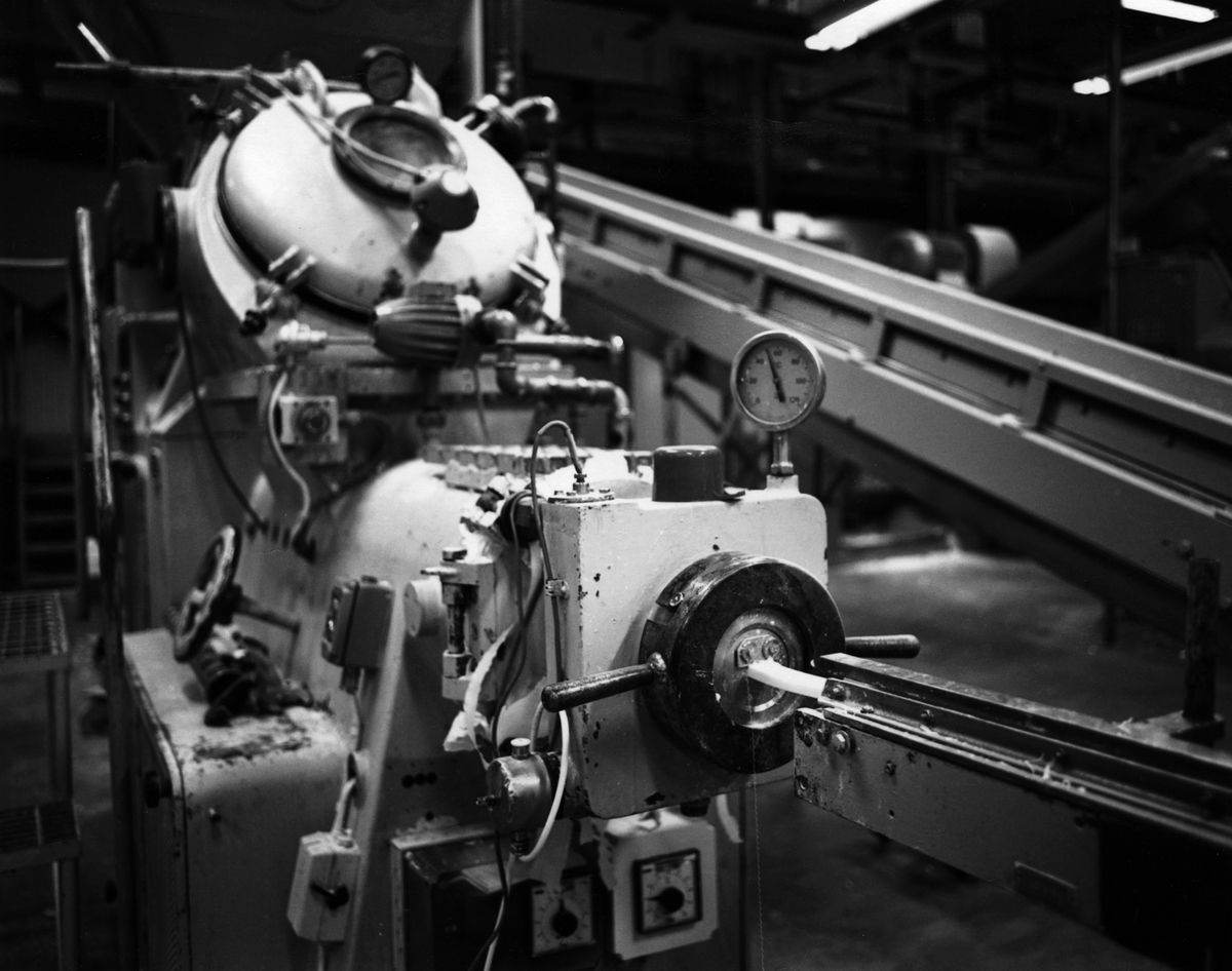 Peloteusen vid hotelltvållinjen. Peloteus kallas denna maskin, som pressar pellets till en stång. Detta är en dubbelpelotuse (två skruvar).