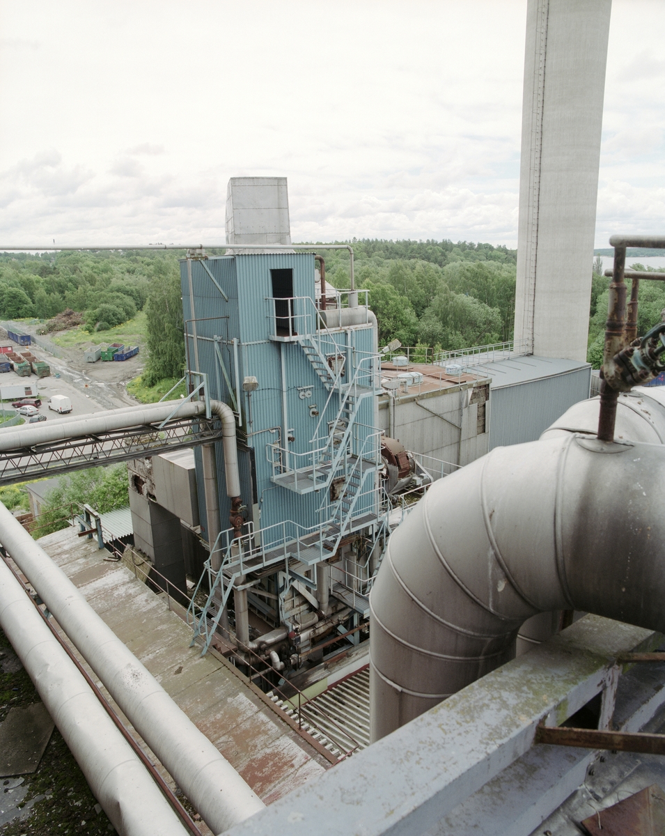 Bildtext: Lövsta sopförbränningsanläggning 2004. Rökgasreningen med sina skorstenar.
