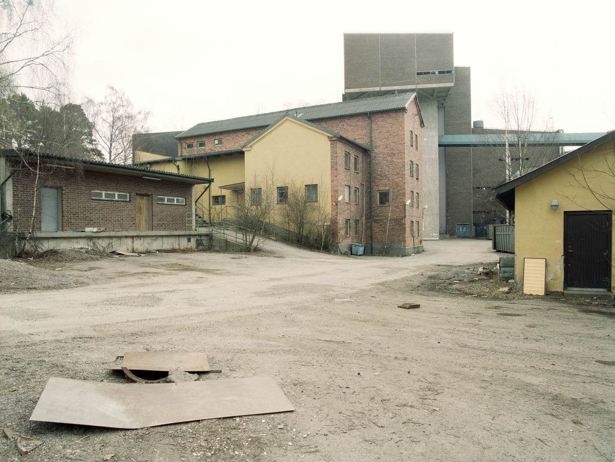 Bildtext: Lövsta. Byggnaderna är från höger: elverkstad, Lövsta gamla sopförbränningsanläggning, Lövsta sopförbränningsanläggning med gaveln från 1960-talet, verkstad med garage och värmescentral.