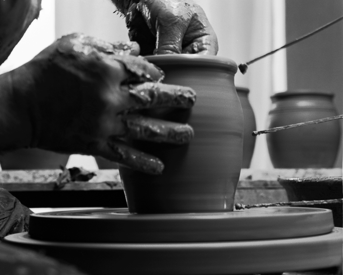 Höjd bredd i det närmaste färdig på krukan. Lägg märke till måttpinnarna.