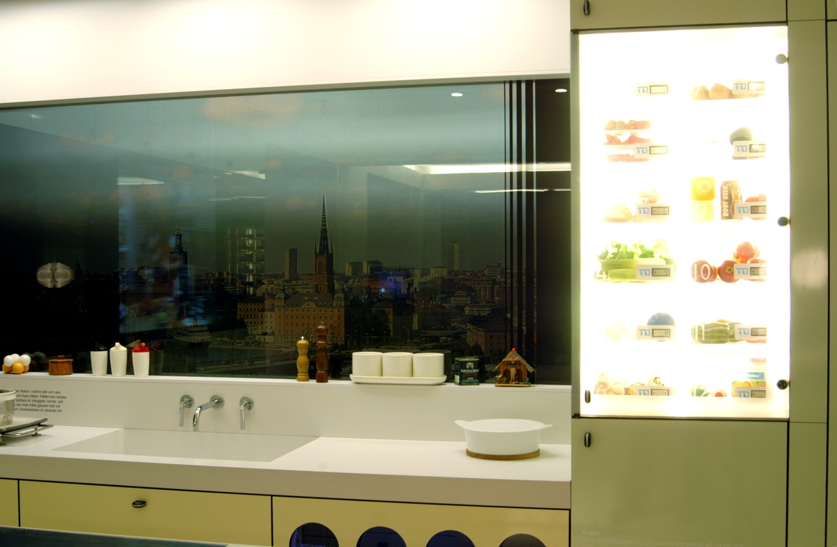 Tänk om. En utställning på Telemuseet om hur det skulle kunna se ut i framtiden i våra hem. I utställningen ingår en film em en familj som skulle kunna tänkas bo i detta hem. Det är ett kök, vardagsrum, sovrum, badrum, uterum och hall. Möbler och teknik som rummen är utrustade med är utvecklat och designat utifrån ett tänkbart framtidssenario. Detta är köket med sitt kylskåp som har hyllor för veckans dagar och fönster/skärm.