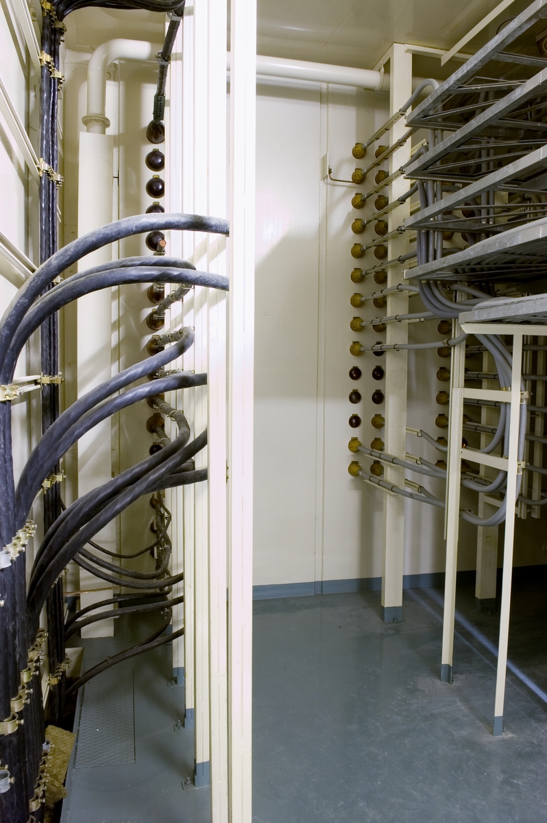 Bilden föreställer: Plan 27 rum 2751. Kabelgenomföringar (starkström) från reaktordelen til KoS-byggnad. Ledningarna splitsades upp och gjöts in i araldit för att få tät och trycksäker genomföring genom plåten. Förklaring av system framgår av rapport :Statens Vattenfallsverk A23/60 5/4 1960.