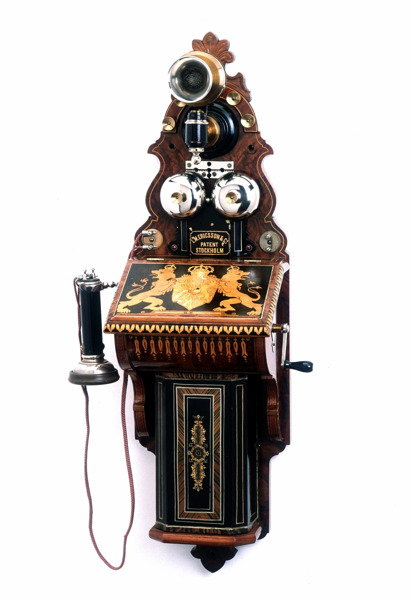 Väggmodell med fast mikrofon, med ett intarsiaarbete av unionsvapnet, men även inläggningar av silver förekommer, på skrivplattan.