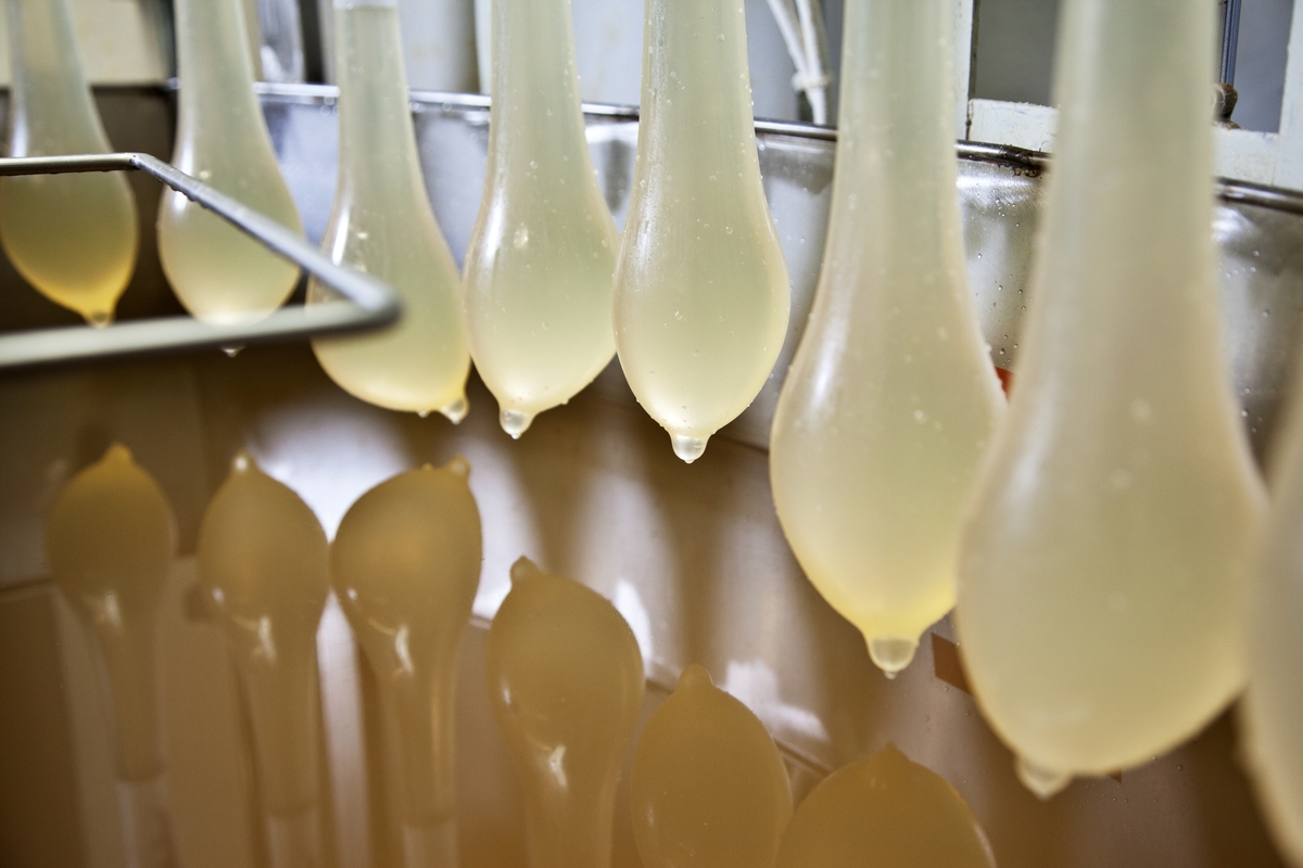 Utställningen 100 innovationer visar de viktigaste innovationerna genom tiderna. Preventivmedlet kondom. Bilden är tagen 2012 på RFSU:s fabrik i Hälsingland. Där testas och förpackas 60 miljoner kondomer per år.