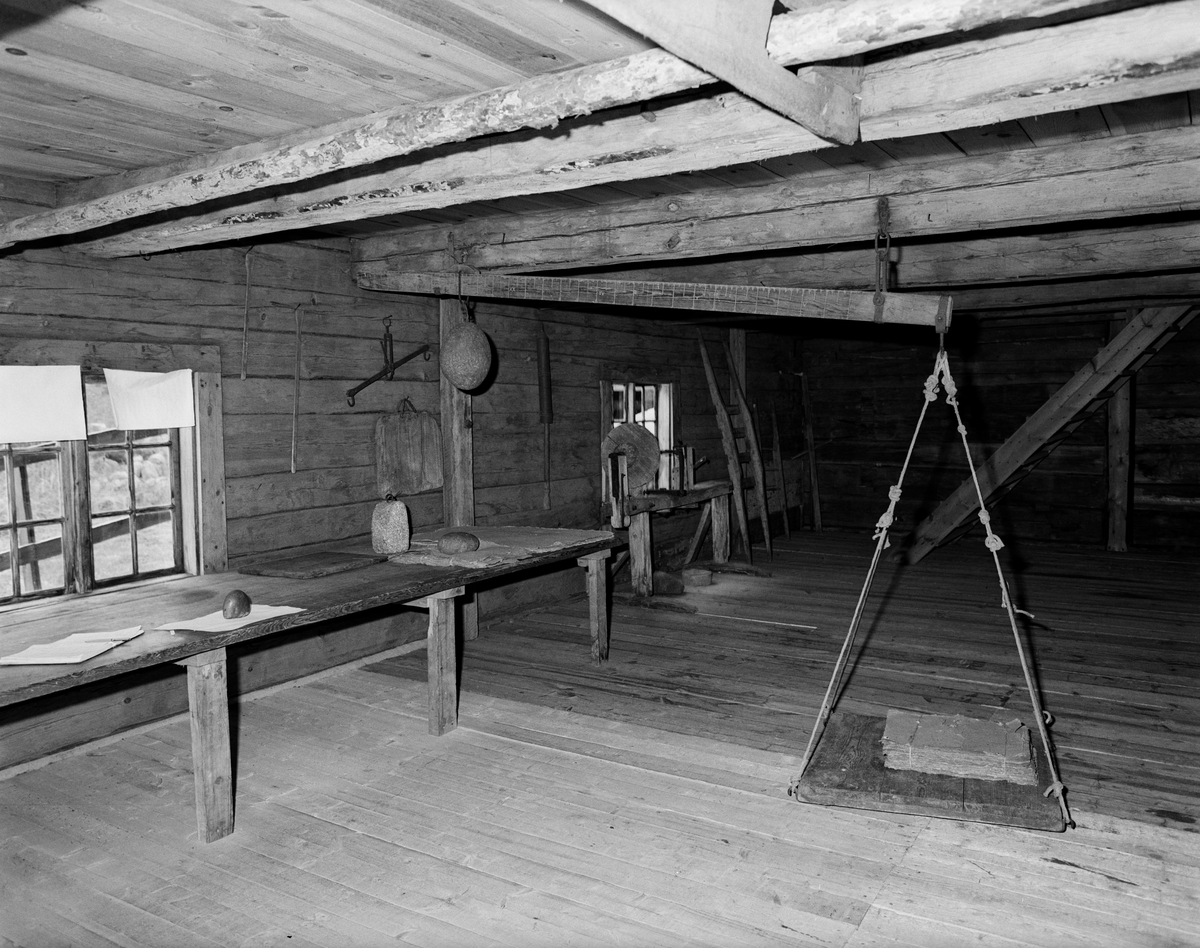 Ösjöfors handpappersbruk. Pack-kammare med pappersvåg och sorteringsbord.