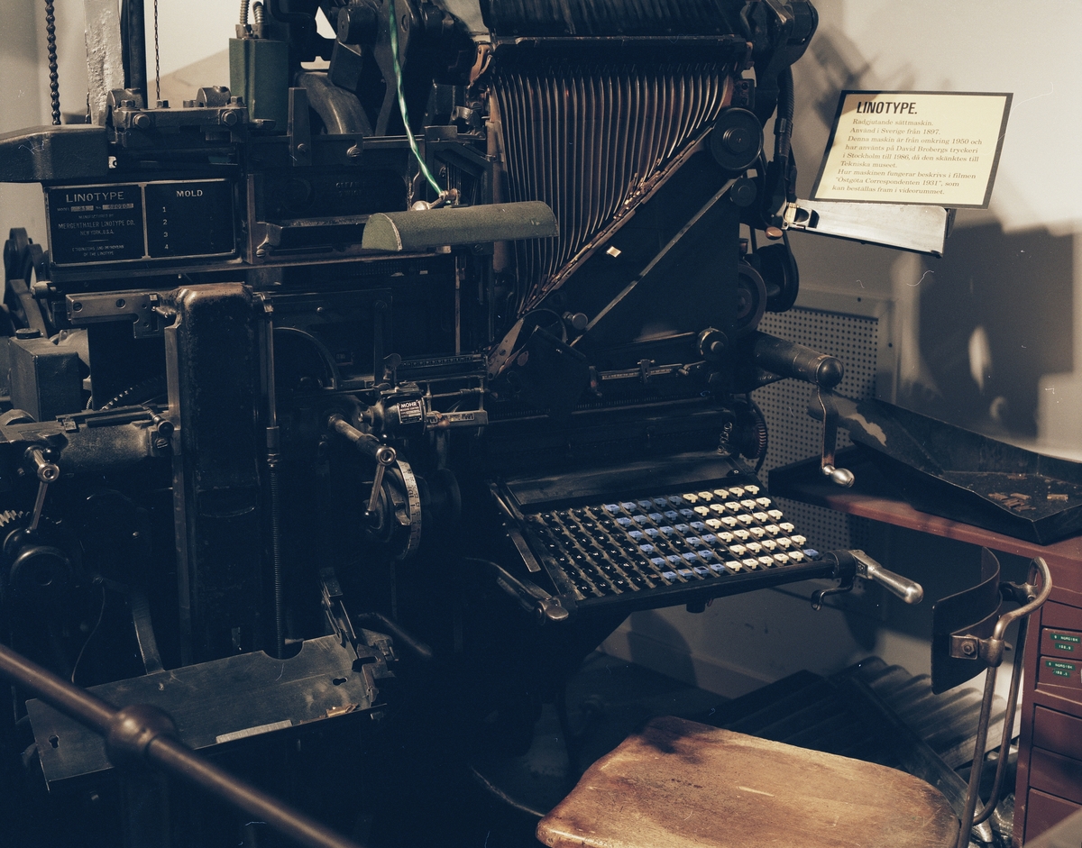 Bilder för Tekniska museets hemsida. Sättmaskin i utställningen "Det tryckta ordet".