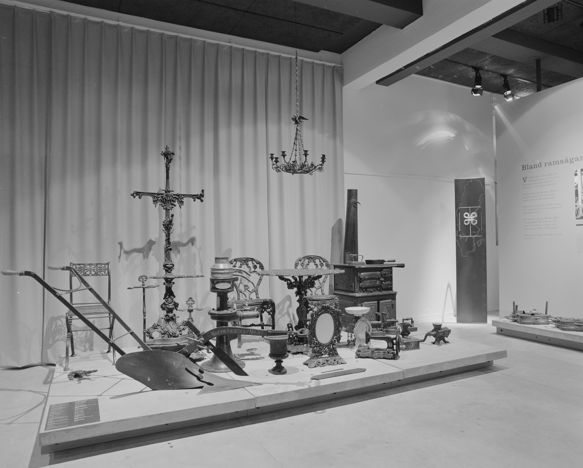 Dokumentation av Ferrum. Gjutjärnsmonter, ljuskrona, stol, plog och stövelknekt.