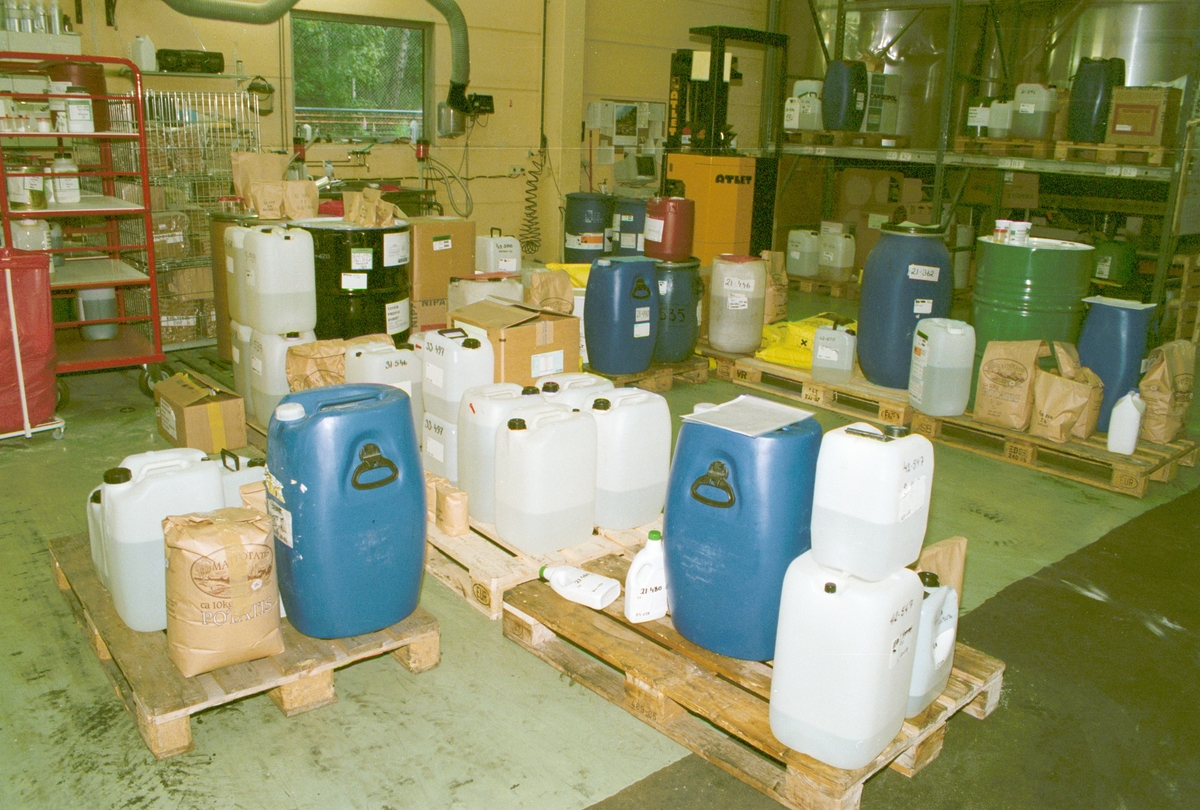 Ingridienserna till olika produkterna ställs färdiga på pallar innan de blandas och förpackas.