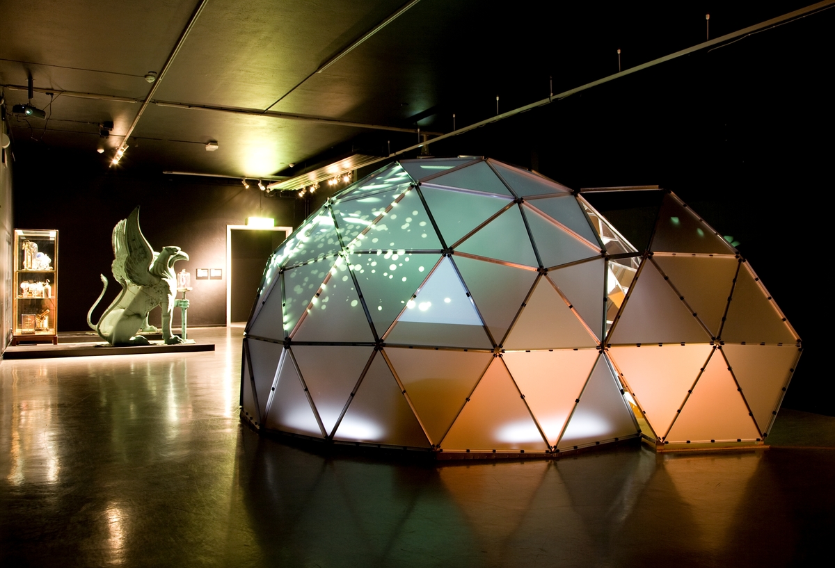Efter att ha tagit av sig skorna får man gå in i byggnaden som återger dig själv i alla trekanter som byggnaden är uppgyggd av och ljussätts utifrån med mönster.