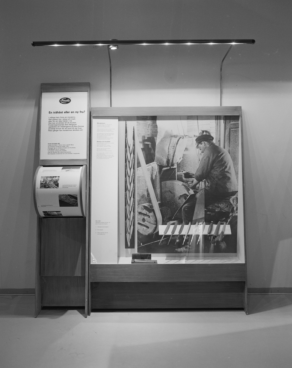 Dokumentation av utställningen "Kulor, Krus och Kaviar", Wallenberghallen. Monter med bild på "Mora kniven". Snurra med produktionsprocessen.