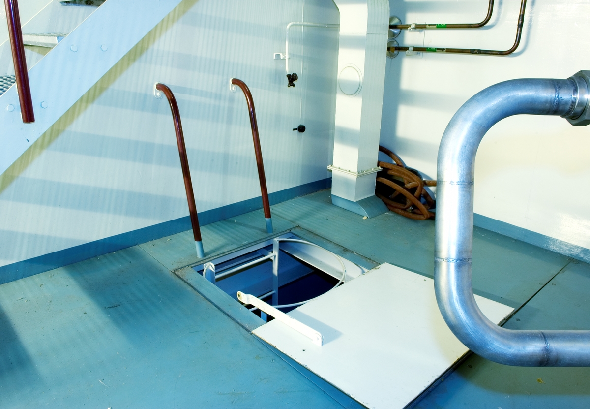 Bilden föreställer: Plan 13 rum 1315 laddmaskinens serviceutrymme nedersta planet.Lucka ned till rum 0015 som är reaktorgraven. Gravens ytterväggar = serviceutrymmets ytterväggar och 15 meter djupt. Ett tomt mörkt utrymme som vi inte fotograferade. Avsikten med denna grav var att när reaktorn hade tjänat ut skulle installationerna samt golvet i serviceutrymmet avlägsnas, reaktorn friläggas och transporteras till och sänkas ned i detta hål. Sedan skulle allt inneslutas i betong. Reaktorn var deponerad. Till höger i bild syns anslutningar för varmvatten som ingår i serviceriggen. Från detta plan finns strålskyddsdörr till bränslebrunnar som inte syns på bilden. Installationer: P209. Förklaring av system framgår av rapport :Statens Vattenfallsverk A23/60 5/4 1960.