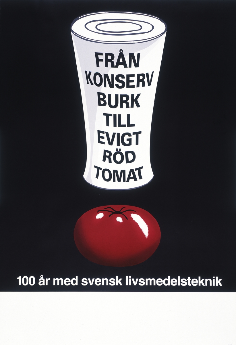 Affisch ur Tekniska museets samlingar. Reklam för utställningen "från konservburk till evigt röd tomat" på Tekniska museet.