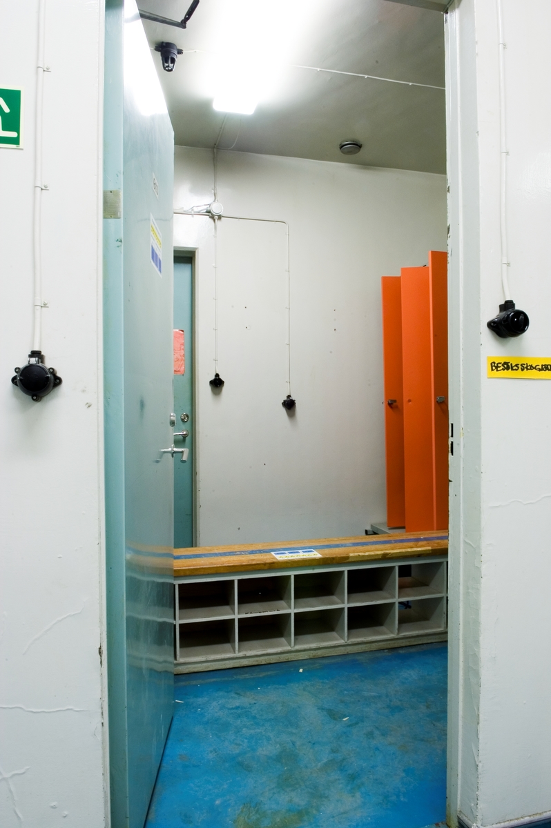Bilden föreställer: Plan 6 KoS byggnaden rum 613. Omklädningsrum för besökare med skogräns. Bilden tagen från korriodor 612. Förklaring av system framgår av rapport :Statens Vattenfallsverk A23/60 5/4 1960.