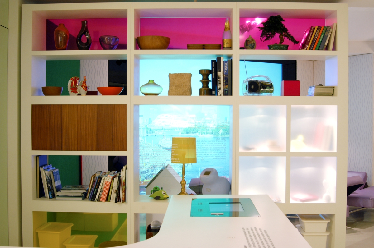 Tänk om. En utställning på Telemuseet om hur det skulle kunna se ut i framtiden i våra hem. I utställningen ingår en film em en familj som skulle kunna tänkas bo i detta hem. Det är ett kök, vardagsrum, sovrum, badrum, uterum och hall. Möbler och teknik som rummen är utrustade med är utvecklat och designat utifrån ett tänkbart framtidssenario.Hyllan mellan köket och vardagsrummet, med köksbänken i förgrunden.