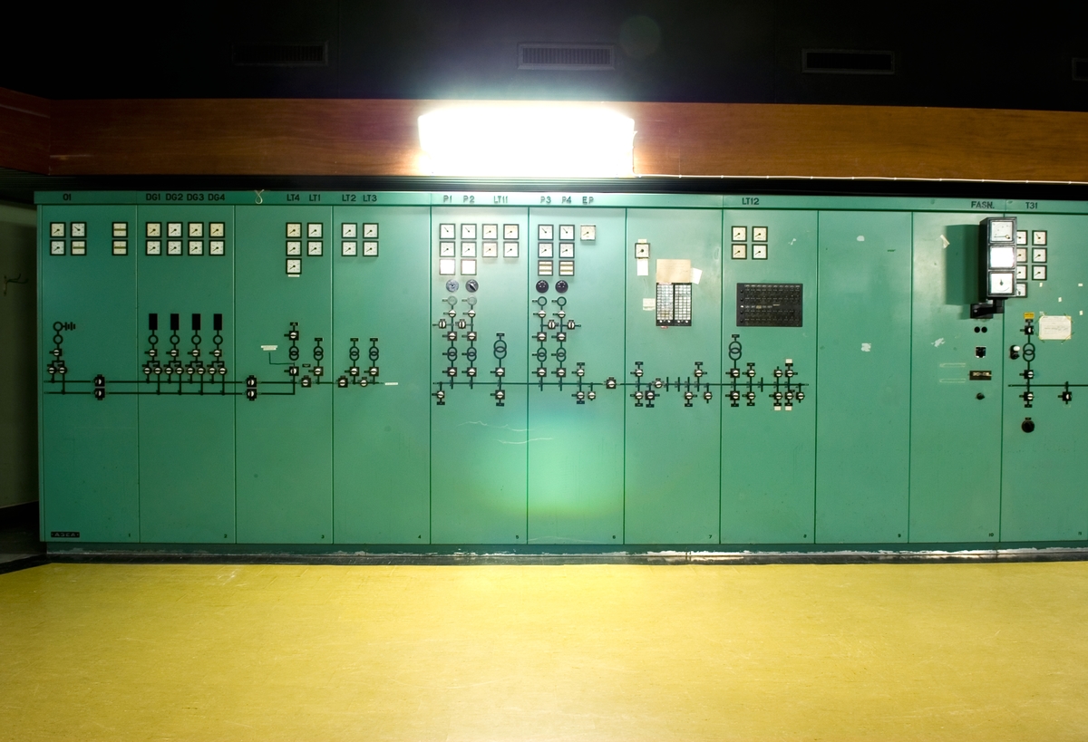 Bilden föreställer: Plan 6, kontrollrum 619. Panel för turbin, kondensor, kyltorn och Farsta centralen. Förklaring av system framgår av rapport :Statens Vattenfallsverk A23/60 5/4 1960.