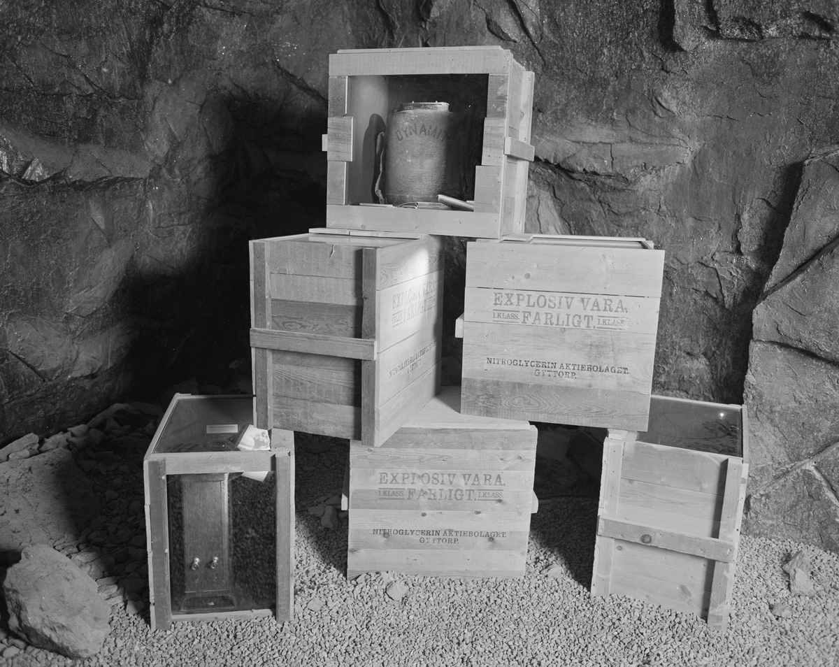 Dokumentation av Gruvan. Andra rummet: "Eld i berget", dynamitlådor.